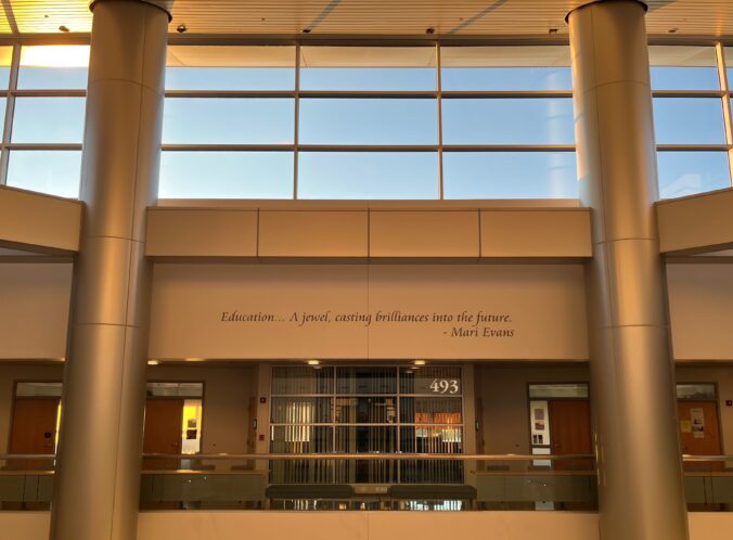 Students sit in the foyer, taking a break between classes, chatting with a friend. On my way to my new office on the fourth floor, the sun pours through the windows, illuminating the atrium. Engraved in the wall up high, in the center of it all, is a Mari Evans quote: